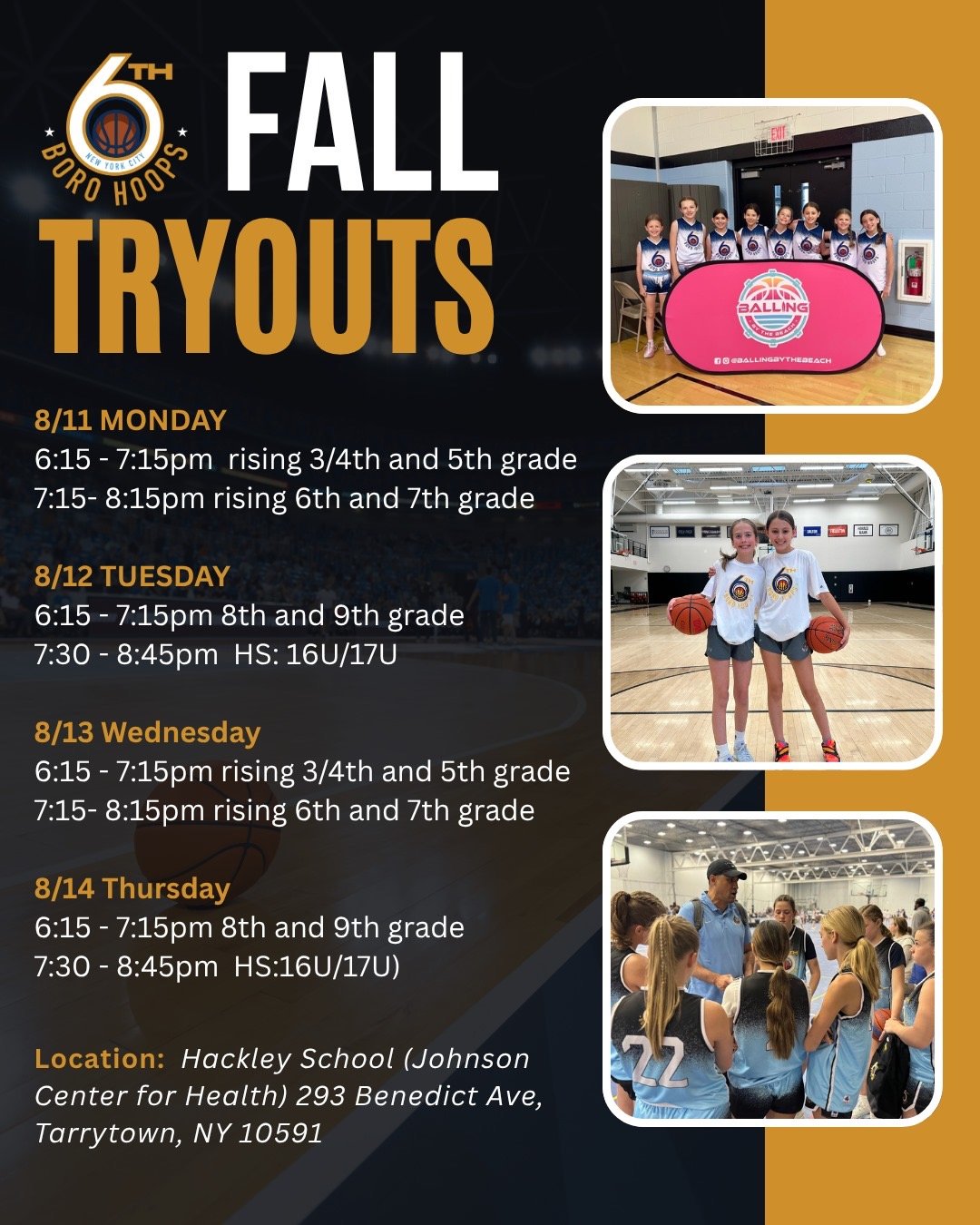 *** If you are interested in trying out for a fall team and dates do not work for you, please contact Coach Scott at scott.k@6thborohoops.com to arrange potential make up tryout dates